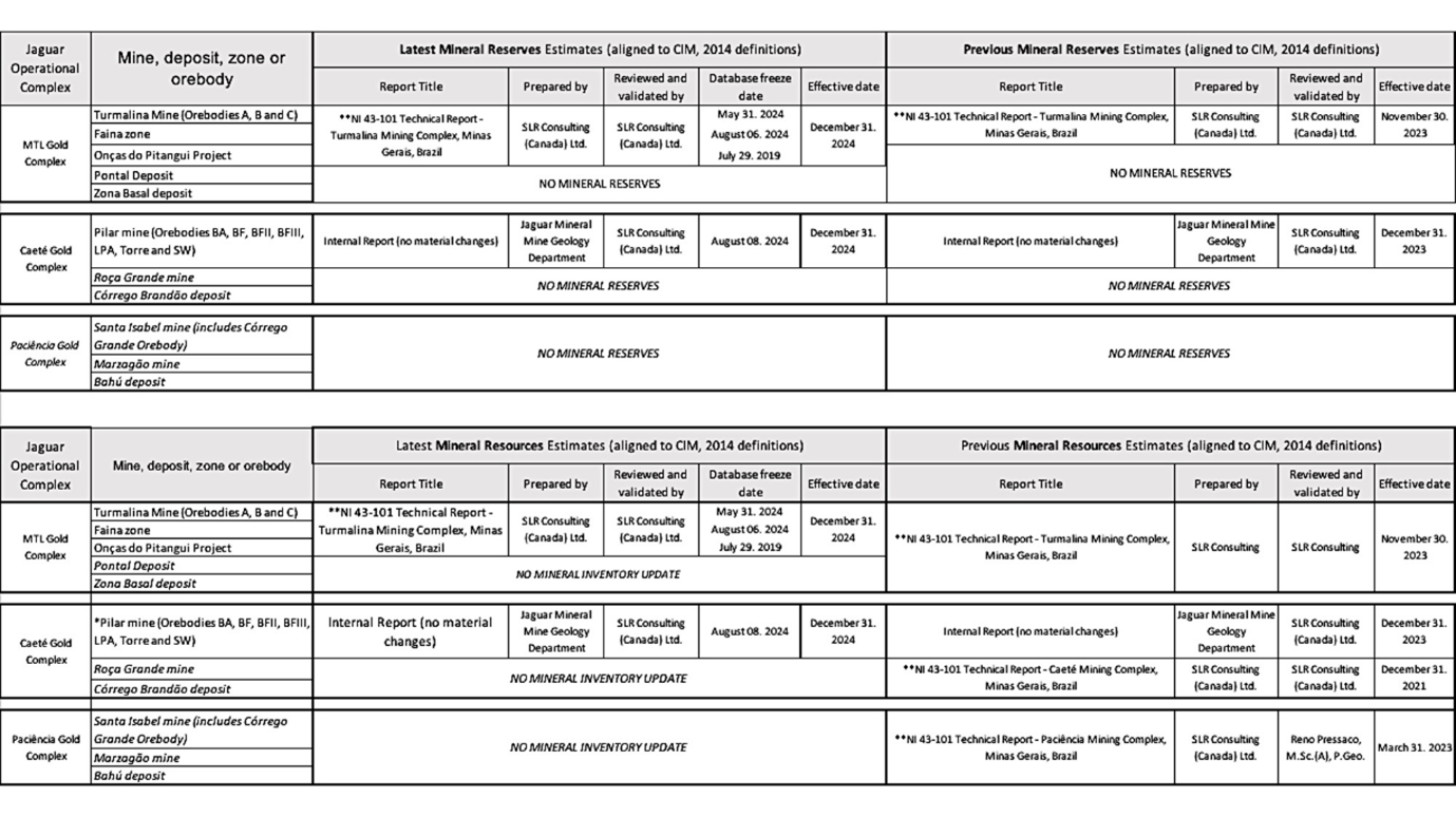 Detailed tabulations and discussion of this 2024 MRMR disclosure may be found within the Company's Annual Information Form for the year ended December 31, 2024, which was filed today. An updated Technical Report for the MTL complex was prepared in accordance with National Instrument 43-101 - Standards of Disclosure for Mineral Projects ("NI 43-101") and also filed today. Both documents can be found under Jaguar's profile on SEDAR+ https://www.sedarplus.ca.