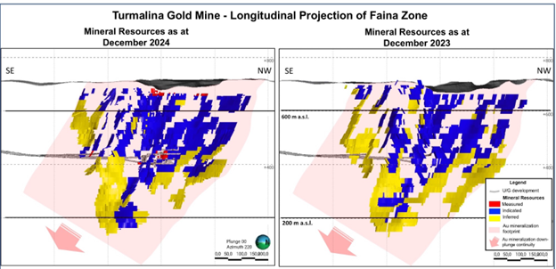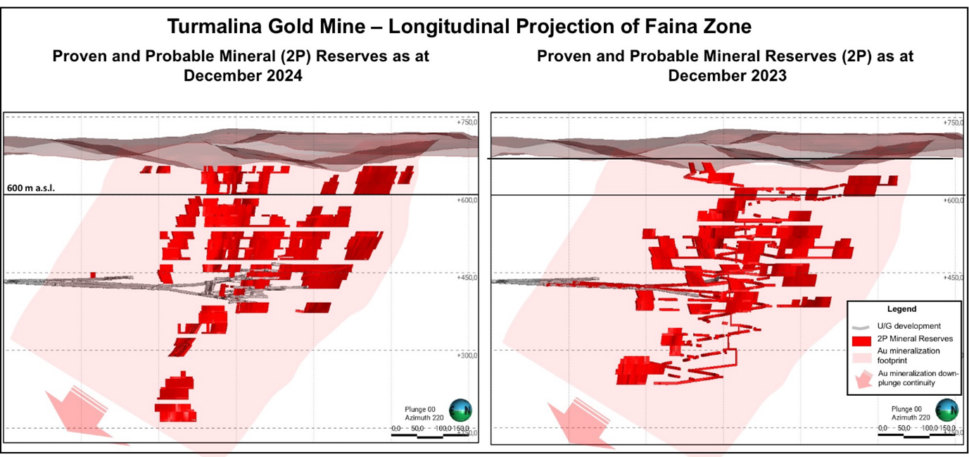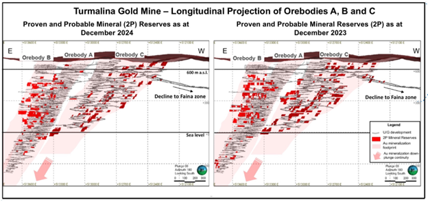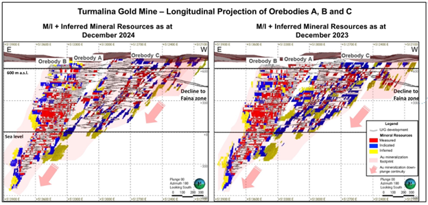 Figure 3. Long Sections showing year-over-year changes in Turmalina mine Mineral Reserves 2024 vs 2023