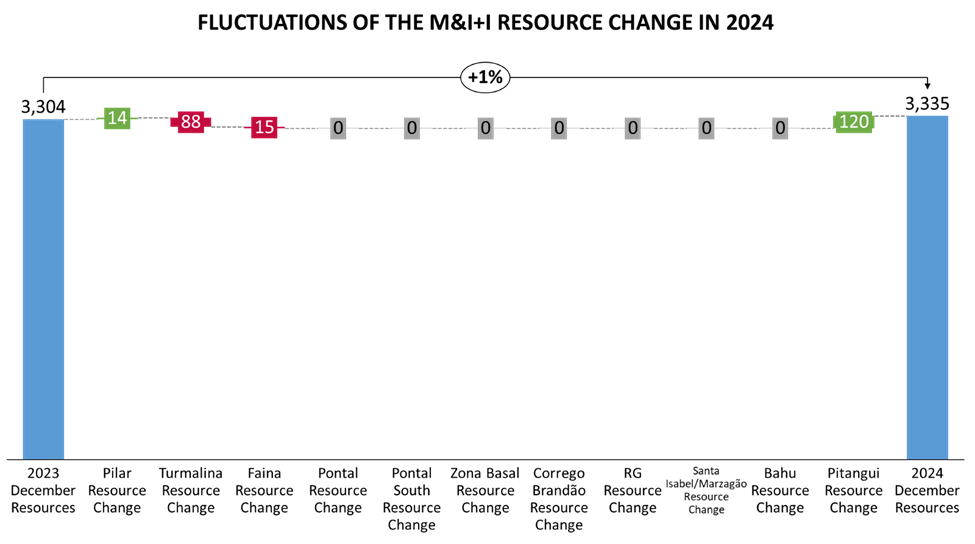 No changes in Mineral Resources inventories were reported in 2024 in the Santa Isabel and Marzagão mines, and the Bahú deposit.