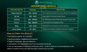 Now, OKALIO Mining also launched an affiliate program, a platform where you can earn money by recommending the site to other people. You can start earning money even without investing. After inviting a certain number of active referrals, you will receive a one-time fixed bonus of up to $60,000. With unlimited referrals, your earning potential is unlimited too!