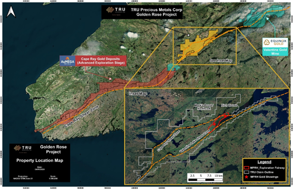 TRU (TSXV:TRU.VN)(OTC-BB:TRUIF)(FSE:706) is on a mission to build long-term shareholder value through prudent natural resource property development. The company's flagship project is the Golden Rose Project a regional-scale 297.50 km2 land package in Central Western Newfoundland (includes a 33.25 km2 package of claims over which TRU has an option with TSX-listed Quadro Resources to acquire up to an aggregate 65% ownership) which straddles a 45 km strike length along the gold deposit-bearing Cape Ray - Valentine Lake Shear Zone, directly between Calibre Mining's Valentine Project and AuMEGA Metals' Cape Ray Gold Project. TRU is currently focused on efficiently discovering the full gold and copper potential at Golden Rose, targeting continuity along this proven gold bearing trend. The Golden Rose Project is currently subject to an Earn-In Agreement with TSX-listed Eldorado Gold Corporation ("Eldorado"), whereby Eldorado has the option to fund CAD15.25M in cash payments and exploration expenditures over 5 years to earn an 80%-interest in the Golden Rose project. Please refer to our July 30th, 2024 press release for further details of the agreement.
