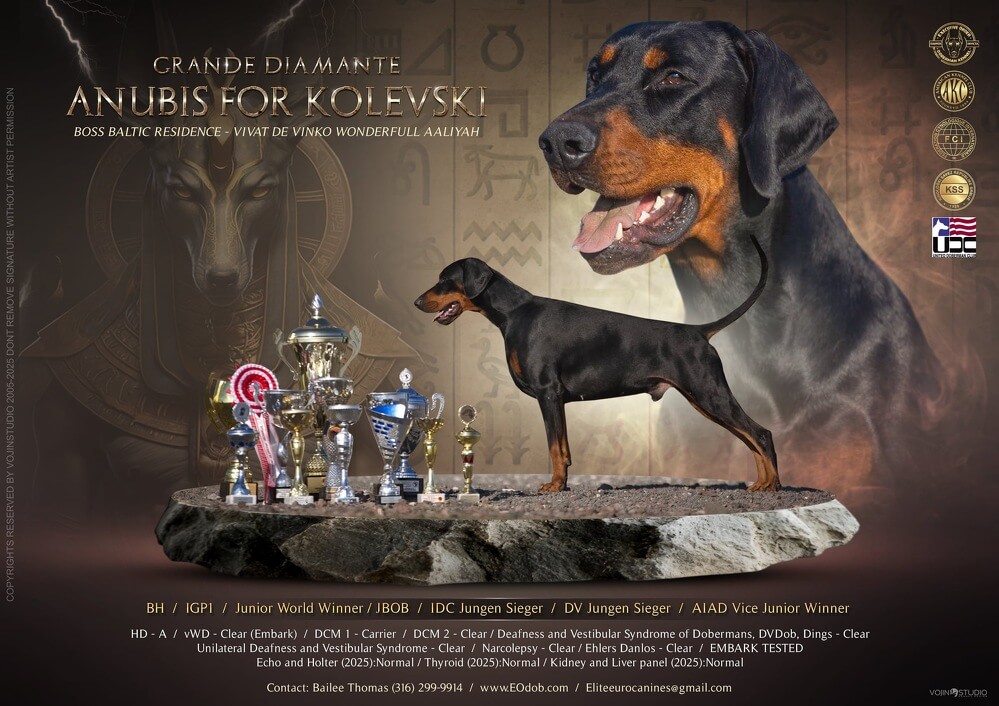 The kennel’s commitment is reflected in its star-studded roster of breeding males. Among them is Multi Champion and Jr. World Winner Grande Diamante Anubis for Kolevski IGP1, one of the most sought-after Dobermans in the European show circuit. He is joined by IntCH Angel of Shaytan Sky No Limit IGP2, who holds champion titles in 10 countries and is a littermate of the 2021 World Winner. These dogs, along with other internationally recognized studs such as CH Archibald IGP1, CH Vis Major Del Nasi BH, and CH Angel of Shaytan Mao Zedong IGP1, form the foundation of a breeding program that consistently produces title-holding offspring.