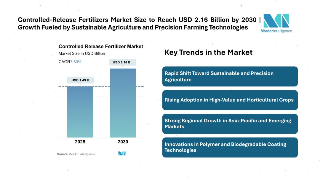 The global controlled-release fertilizers market is projected to grow from USD 1.49 billion in 2025 to USD 2.16 billion by 2030, registering a CAGR of 7.8% during the forecast period (2025–2030). The market’s momentum is driven by the global transition toward sustainable farming systems, precision agriculture, and the rising need to enhance nutrient-use efficiency while minimizing environmental impact.