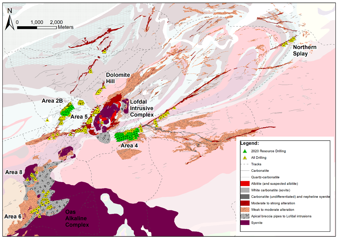 The HREE mineralization covers a huge area of over 15 km by 10 km. Only a very small fraction of the known mineralized systems underwent resource drilling so far, namely Area 2B and Area 4, see map below. These two sub-deposits form the basis for the current Prefeasibility Study "Lofdal 2B-4". Therefore, the project can most likely be significantly expanded by future exploration.