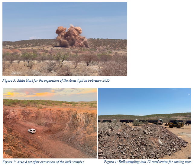 The Area 4 pit was extended and over 2,100 t of bulk samples extracted from a depth between 12 and 17 m. The bulk samples were taken according to the four ore blocks from the footwall to the hanging wall, representing ore variability with different country rocks forming the matrix of the mineralization and enveloping the ore zone. The bulk samples are currently crushed and screened for extended XRT and XRF sorting tests at Gecko Namibia and RADOS South Africa.