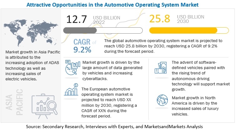 The global automotive operating system market is projected to grow from USD 12.7 billion in 2022 to USD 25.8 billion by 2030, at a CAGR of 9.2%. Parameters such as increasing sales for premium cars, paired with rising adoption of ADAS technology by automotive OEMs are expected to support the revenue growth of the automotive operating system market during the forecast period. Further, developments in autonomous vehicles, coupled with increasing penetration of electric vehicles will create lucrative opportunities for the automotive operating system market. The major players in the automotive operating system market are BlackBerry Limited (Canada), Automotive Grade Linux (US), Microsoft Corporation (US), Apple Inc. (US), and Alphabet Inc. (US). These companies have strong product portfolio that offer automotive operating system such as Linux, Android, and QNX, among others to automotive OEMs. These companies have adopted growth strategies such as partnerships, collaborations, and mergers & acquisitions to gain traction in the global automotive operating system market.