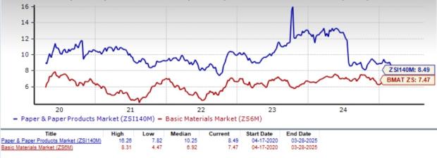 E-commerce & Consumer Products to Support Packaging Demand: Despite the current headwinds, the industry’s exposure to consumer-focused markets, such as food, beverages and healthcare, ensures stable earnings growth. With the rise of e-commerce, packaging has gained the utmost importance as it helps maintain the integrity of the products and withstand the complexities of delivery. According to Statista, global e-commerce revenues are expected to reach $4.3 trillion in 2025 and see a compound annual growth rate (CAGR) of 8% between 2025 and 2029. Turkey is expected to lead, followed by Brazil and India. By 2026, the U.S online retail market is forecast to surpass the $1.5 trillion mark. The China e-commerce market is expected to attain $2 trillion in 2027. This presents a major growth opportunity for the Paper and Related Products industry.