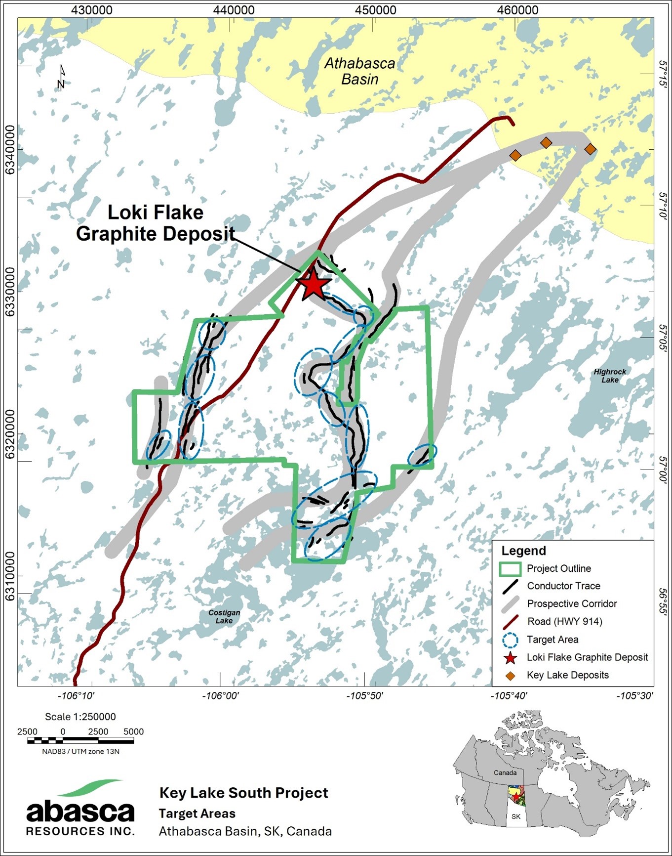 Abasca is a mineral exploration company that is primarily engaged in the acquisition and evaluation of mineral exploration properties. The Company owns the Key Lake South Project (KLS), a 23,977-hectare exploration project located in the Athabasca Basin Region in northern Saskatchewan, approximately 15 km south of the former Key Lake mine and current Key Lake mill. The project possesses geological similarities and along strike of past Key Lake Mine with prospective conductors of over 50 km for potential uranium mineralization. KLS is also host to the Loki Flake Graphite Deposit comprising a total inferred resource of 11.31 Mt at 7.65 % Cg. Please refer to the Company's news release dated April 15, 2025 for further information about the resource estimate.