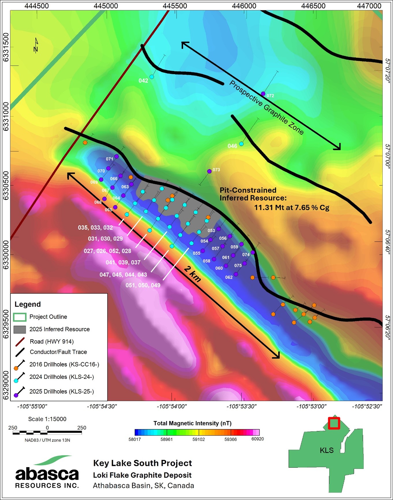 SASKATOON, SK / ACCESS Newswire / April 22, 2025 / Abasca Resources Inc. ("Abasca" or the "Company") (TSXV:ABA.VN) is pleased to announce the completion of its 2025 Winter Program at its 100% owned Key Lake South Project (KLS; Table 1, Figure 1). The program consisted of 5,925 m of drilling that was focused on drilling the northwest and southeast extensions of the Loki Flake Graphite Deposit (the "Loki Deposit" (see Figure 2)) as well as to the north of the Loki Deposit.