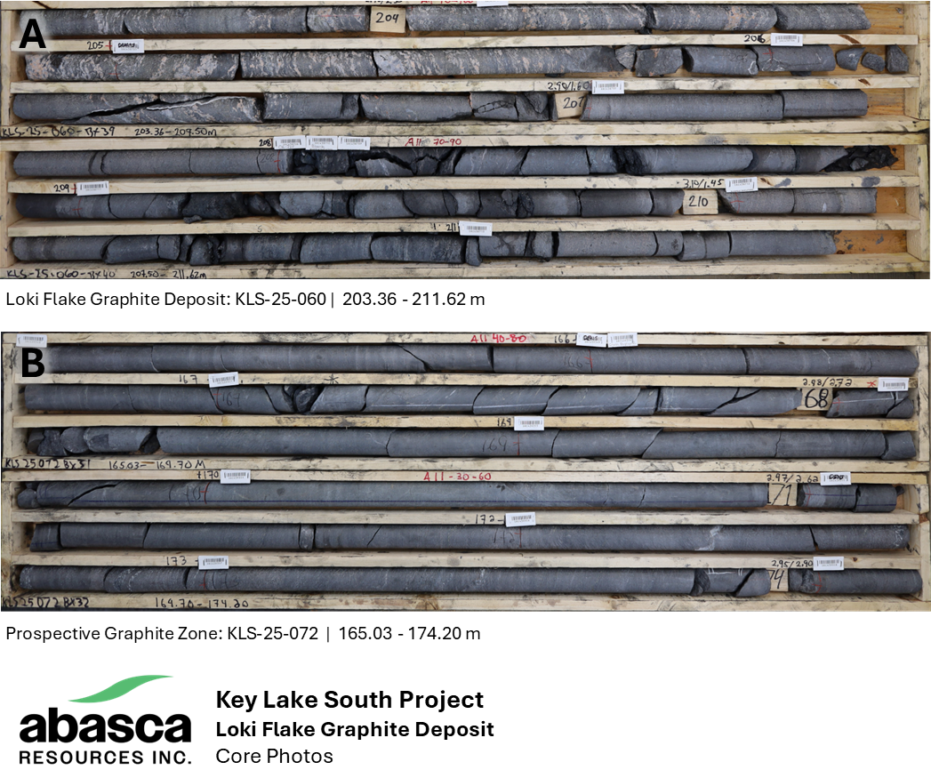 Figure 3: Core photos from the 2025 winter drill program at the Key Lake South Project. A) Graphite mineralization from KLS-25-060 (full intersection not shown), 300 m along-strike toward the southeast of the 2024 summer drilling that defined the Loki Flake Graphite Deposit. B) Strong graphite mineralization from a 45 m intersection within KLS-25-072, drilled toward a parallel conductor north of the Loki Deposit.