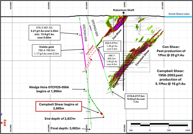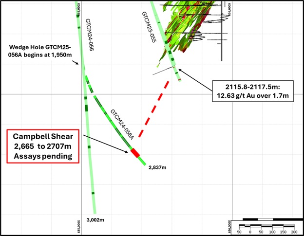 Figure 1 below is a cross-section showing the master hole GTCM24-056 and wedge hole GTCM25-056A intersecting the CS at 2,665 metres downhole. The CS was initially intersected at depth in hole GTCM23-055, which intersected 12.63 g/t Au over 1.7m (refer to November 15, 2023 news release) in the CS structure approximately 150 metres below the Con Mine workings, demonstrating the potential of the CS is well open at depth. Figure 1a, further below shows wedge hole GTCM24-056A in greater detail.