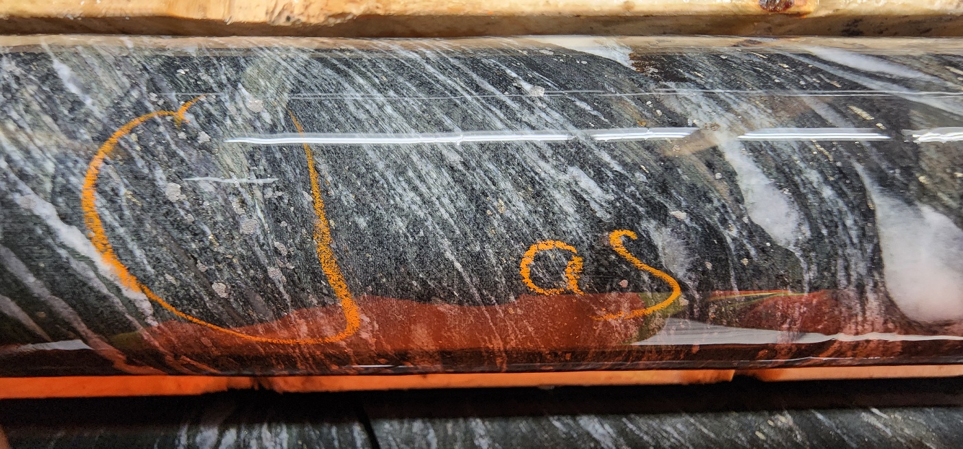 The CS zone starts at around 2,665 metres downhole, signified by an intensifying zone of crackle-style calcite brecciation and veining. From 2,681.20 metres downhole, shearing is more intense including some intervals with more veining, such as from 2,689.30 to 2,697.70 metres downhole, and containing laminated smoky quartz veins with up to 2% disseminated fine- to medium-grained pyrite and 1% blebby fine-grained pyrrhotite. Sphalerite is also noted.