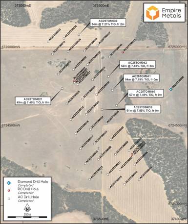 There are broad zones of high-grade mineralisation over the weathered zone, for example 57m @ 7.48% TiO2 from surface [AC25TOM040] and 49m @ 7.49% TiO2 from surface [AC25TOM021]. There are broad zones of high-grade mineralisation close to surface, for example 16m at 10.00% TiO2 from 6m [AC25TOM040] and 14m at 10.06% TiO2 from 4m [AC25TOM041].