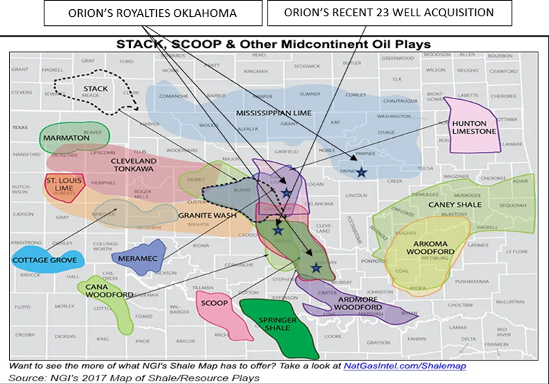 "We were recently notified that Citizen Energy has drilled 2-2-mile horizontal wells on our Kingfisher County royalty acreage. We are being pooled into a 640-acre horizontal drilling and spacing unit on our Kingfisher County Oklahoma acreage. Our recent acquisition in northwest Colorado puts us in prolific oilfields with a 10.17% royalty across more than 10,000 acres. We are cash flow positive on all of these recent acquisitions and have already generated significant income from these properties." Commented Tom Lull, CEO of Orion. We are working towards re-entering our Eagle Ford property as we have analyzed data for massive gas shows. We recently sold oil on Orion's Eagle Ford property as well. We are not slowing down, and I will continue to build value for our shareholders. Orion now owns 53,000 mineral acres in the Bakken, Permian Basin, Piceance Basin, Eagle Ford, and Scoop Stack of Oklahoma. "