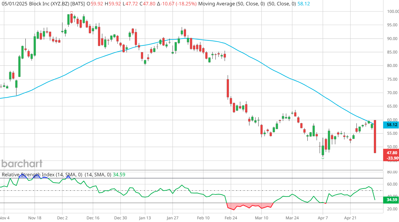 Block (XYZ) stock has cratered more than 16% in after-hours trading this Thursday, after the fintech company’s first-quarter 2025 results fell significantly short of market expectations. Q1 adjusted earnings of $0.56 per share missed analysts’ forecasts of $0.98, while Block’s revenue of $5.77 billion fell below the anticipated $6.21 billion.Â