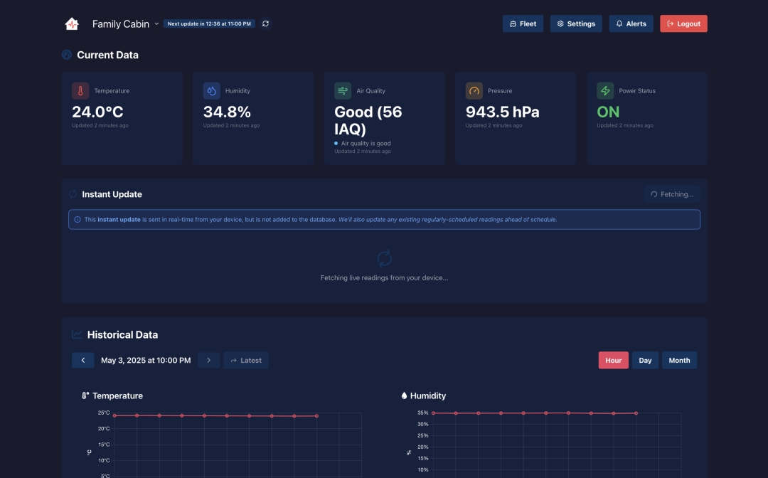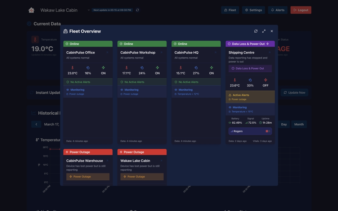 - Fleet View: CabinPulse now offers a Fleet View dashboard for customers with multiple devices or properties. This feature provides a consolidated overview where users – such as owners of several cabins, property managers, or commercial facility managers – can monitor all their CabinPulse units at a glance. The online dashboard displays key data (temperature, humidity, power status, etc.) and alert states for each location in one screen, making it easy to spot issues across an entire portfolio of properties simultaneously. Fleet View simplifies remote oversight, enabling efficient management of many sites without needing to check each device individually.