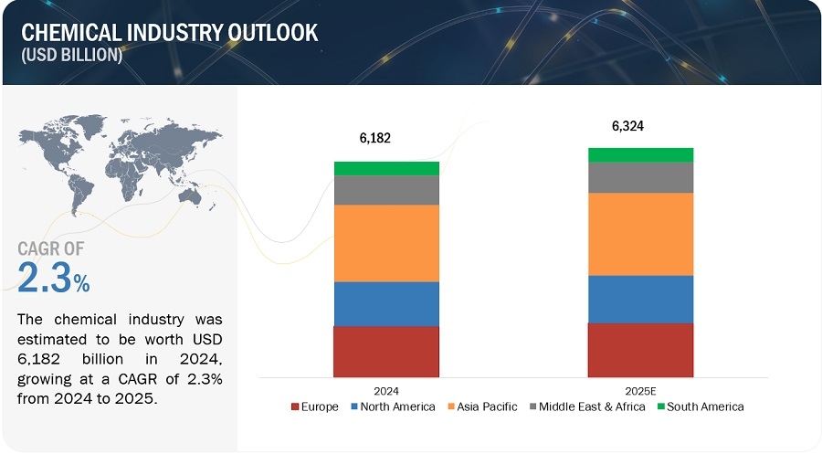 The report "Global Chemical Industry Outlook 2025", global chemical industry will grow from USD 6,182 billion in 2024 to USD 6,324 billion by 2025 at a YoY increase of 2.3%. The glonal market research report is a comprehensive analysis of the current market trends, demand, size, share and Chemical Industry Outlook 2025 with future prospects, and other pivotal factors that drive the market. The global chemical industry is entering 2025 with a positive outlook. The industry has faced multiple challenge in 2023 such as unstable energy prices, increasing feedstock prices, and geopolitical tensions such as Russia-Ukranian war These factors led to decline in the production in 2023 due to which the global chemical out increased marginally only. However, in 2024, a recovering trend took shape, fueled by a synergy of lower energy prices, and renewed demand from crucial sectors such as semiconductors and automotive production. The American Chemistry Council projected a 3.4% increase in 2024 production, with this growth rate expected to be equivalent in 2025; this is a positive trend from the market dynamics perspective.