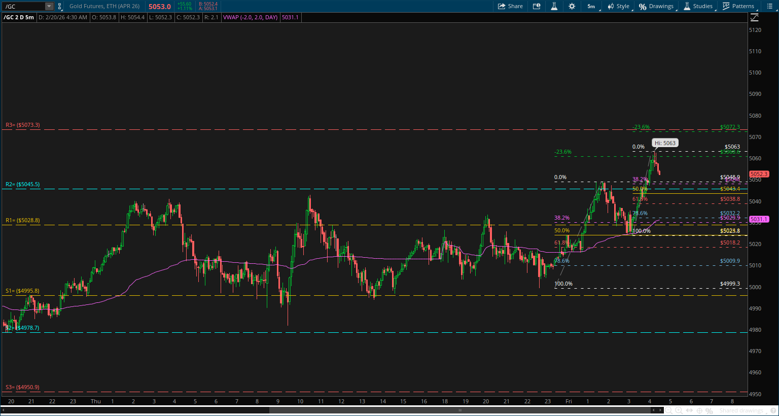 Spot gold reclaimed the $5,000 level after reaching an overnight low of 4,999.1, as market participants evaluated risks related to potential conflict between the United States and Iran, alongside the Federal Reserve’s relatively hawkish minutes released late Wednesday. Market dynamics currently reflect a divergence between fundamental traders, who assess gold’s value in relation to Treasury yields and the US dollar, and speculators positioning gold as a traditional safe-haven asset. Early trading today was subdued, with a subsequent Fibonacci retracement following the initial overnight high of 5,048.9. Participation remained limited, keeping market sentiment cautious; however, the profit target was achieved after a pullback to 5,023.8, and the price moved to 5,063.