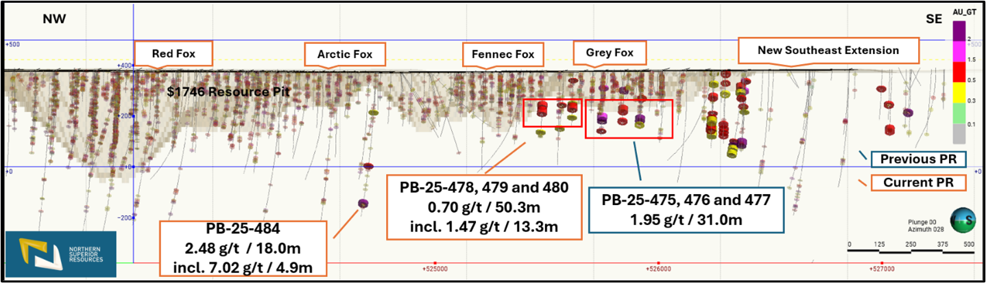 "We're particularly excited by hole PB-25-484, which delivered both significant grade and width, demonstrating the strong potential to add high-quality ounces to our overall resource base. This intercept confirms that mineralization continues down-dip and becomes enriched at vertical depths exceeding 500 metres, providing compelling targets for continued expansion. In addition, we intersected significant mineralization across a 150-metre strike length in an area that had seen limited historical drilling. Situated between the Fennec Fox and Grey Fox zones, these new intercepts-together with previously reported results-highlight the potential to define a continuous, 400-metre mineralized corridor underneath the current pit shell, where its geometry remains shallow compared to the depth of the Red Fox Zone (See Figure 1)," added Adree DeLazzer, Vice President of Exploration.