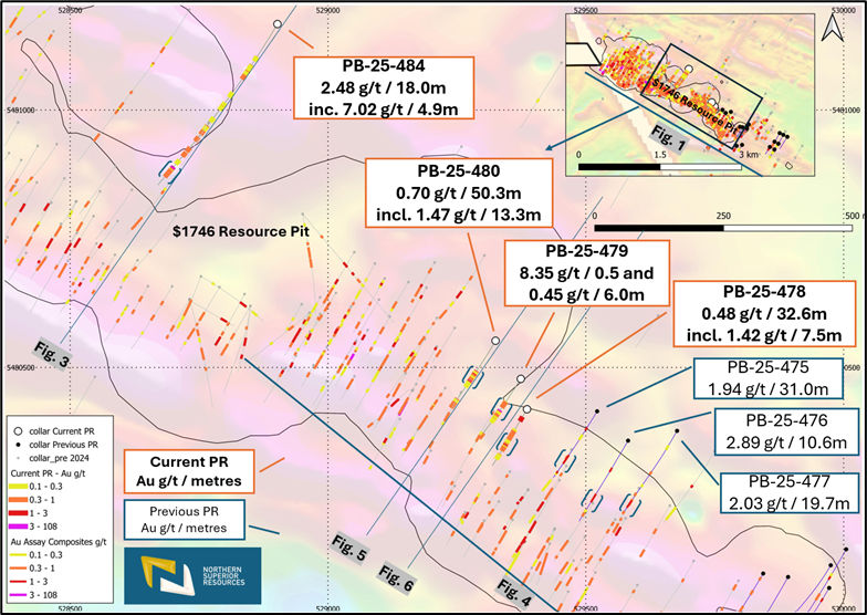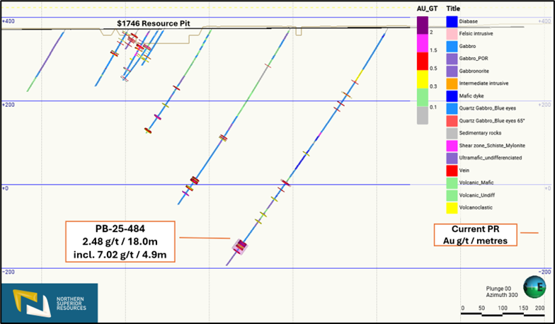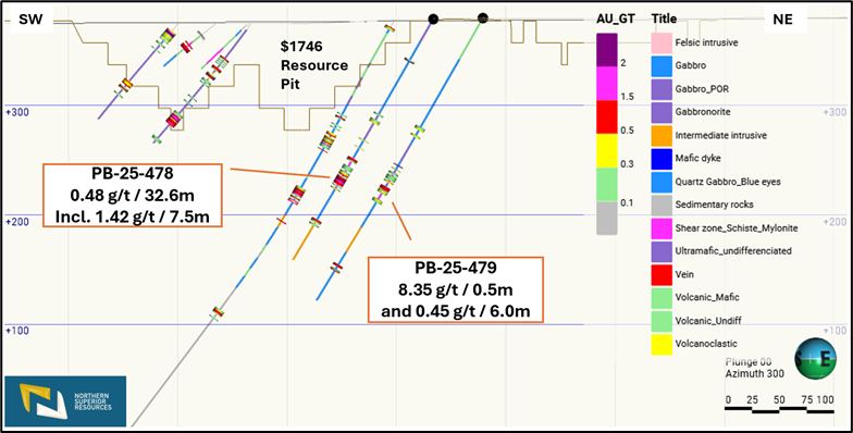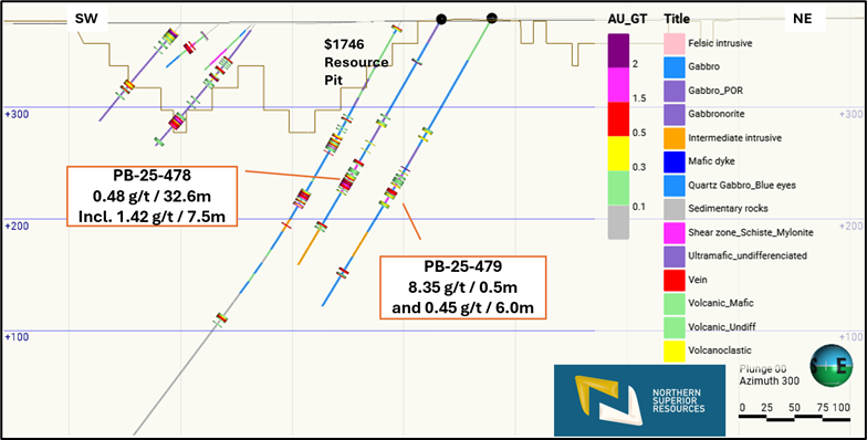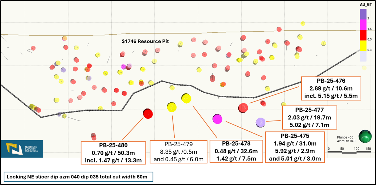 PB-25-480, drilled 80 metres west of PB-25-479, intersected 0.70 g/t Au over 50.3 metres, including 1.47 g/t Au over 13.3 metres, at a vertical depth of 160 metres, approximately 100 metres below the resource pit in an area where the pit shallows to surface (see Table 1 and Figures 1, 2, 4 and 5).