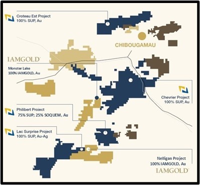The Philibert Project is located 9 km from IAMGOLD Corporation's Nelligan3 Gold project. Philibert hosts a maiden 43-101 inferred resource of 1,708,800 ounces Au and an indicated resource of 278,900 ounces Au.4 Northern Superior holds a majority stake of 75% in the Philibert Project, with the remaining 25% owned by SOQUEM, and retains an option to acquire the full 100% ownership of the project. Chevrier hosts an inferred mineral resource of 652,000 ounces Au (underground and open pit) and an indicated mineral resource of 260,000 ounces Au.5 Croteau hosts an inferred mineral resource of 640,000 ounces Au.6 Lac Surprise hosts the Falcon Zone Discovery, interpreted to be the western strike extension of IAMGOLD Corporation's Nelligan Gold project.