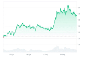 Solana (SOL) is making strong strides in the blockchain universe, currently trading at $167 and showing robust performance with a recent 26% monthly gain. Known for its leadership in decentralized finance (DeFi) and non-fungible tokens (NFTs), Solana continues to attract attention with its low fees and high transaction speeds.