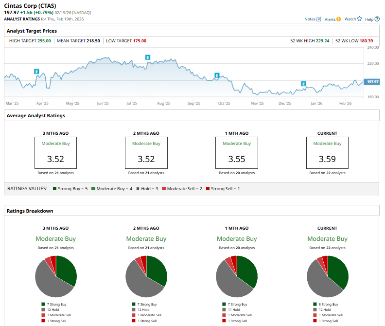 Among the 22 analysts covering CTAS stock, the consensus is a “Moderate Buy.” That’s based on eight “Strong Buy” ratings, 12 “Holds,” one “Moderate Sell,” and one “Strong Sell.”