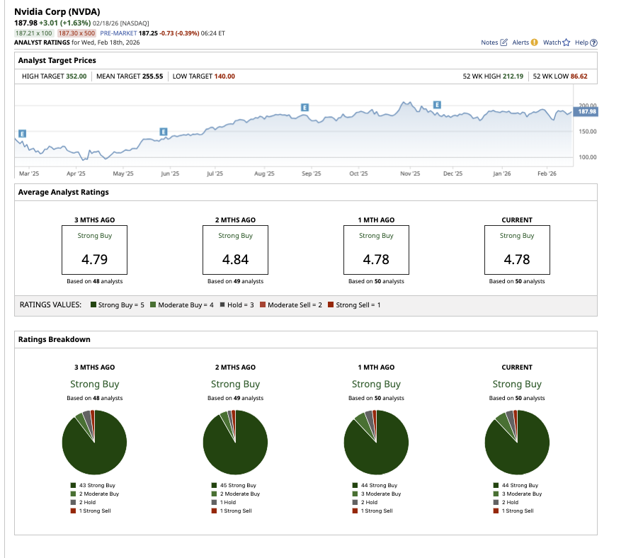 Overall, analysts rate NVDA stock a “Strong Buy.” Of the 50 analysts covering the stock, 44 rate it a “Strong Buy,” three say it is a “Moderate Buy,” two rate it a “Hold,” and one says it is a “Strong Sell.” The average target price of $255.55 implies NVDA stock can rally as much as 36% from current levels. The high price estimate of $352 suggests the stock can climb 87% over the next 12 months.