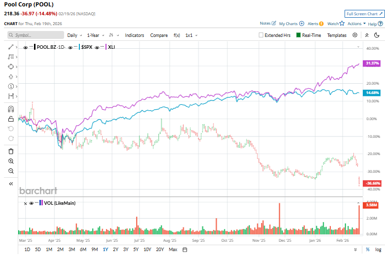 On Feb. 19, Pool Corporation’s shares dropped 13% after the company reported disappointing Q4 2025 results and issued a weaker-than-expected 2026 outlook. Its sales dopped 1% year over year to $982.2 million, missing estimates, while EPS fell to $0.84 from $0.97 and also came in below forecasts. The negative reaction was amplified by 2026 EPS guidance with a midpoint of $11, which trailed analyst expectations and signaled concerns about near-term profitability and growth.