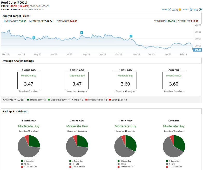 The company has a consensus “Moderate Buy” rating overall. Of the 15 analysts covering the Pool stock, opinions include five “Strong Buys,” nine “Holds,” and one “Moderate Sell.”