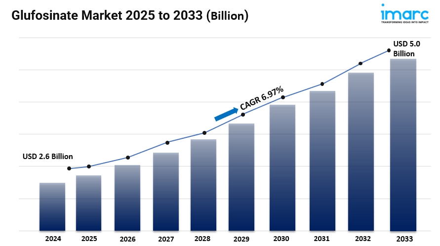The global glufosinate market size reached USD 2.6 Billion in 2024. Looking forward, IMARC Group expects the market to reach USD 5.0 Billion by 2033, exhibiting a growth rate (CAGR) of 6.97% during 2025-2033.