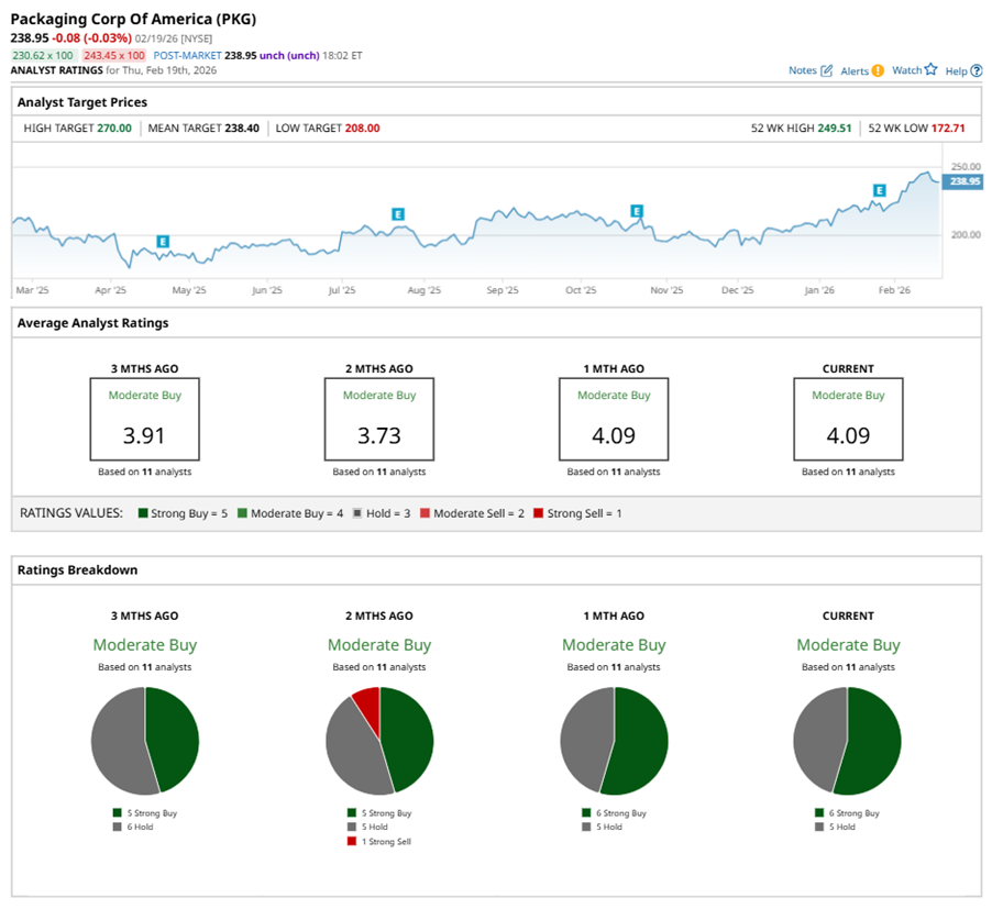 On Feb. 2, JPMorgan Chase & Co. (JPM) analyst Detlef Winckelmann maintained a “Buy” rating on PKG and set a price target of $250, implying a potential upside of 4.6% from current levels.