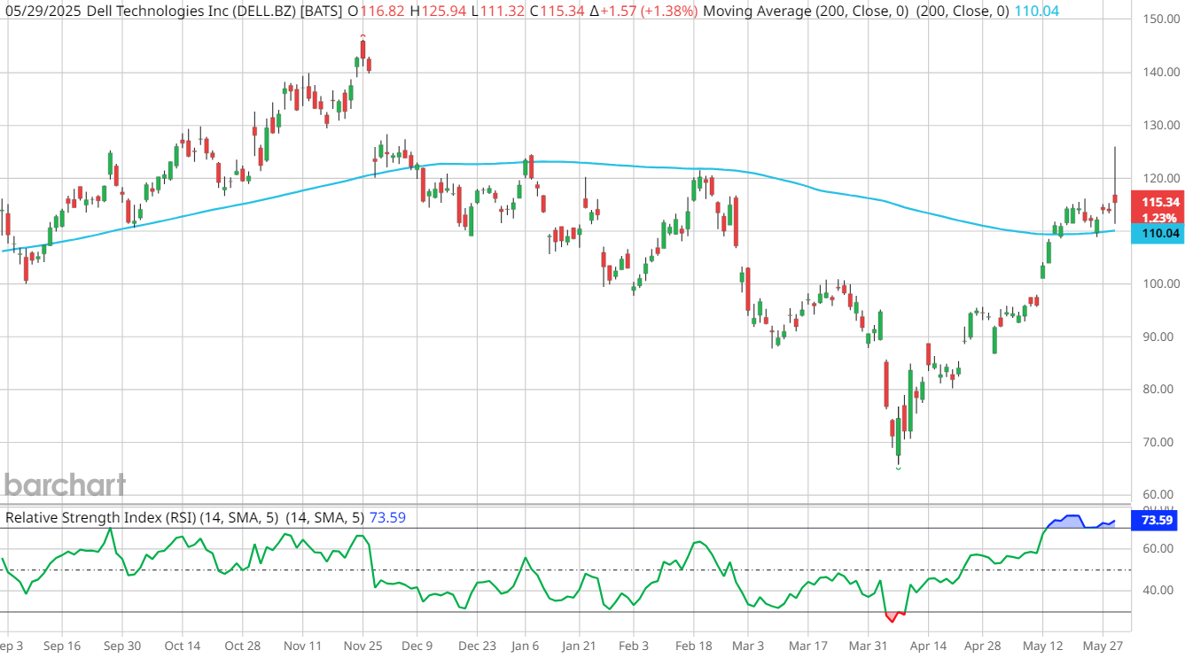 DELL is up about 1% in after-hours trading, extending a recent breakout above its 200-day moving average. Based on its 14-day Relative Strength Index (RSI), the stock has been lingering in overbought territory for quite a while, which means Dell stock is vulnerable to a reversal.