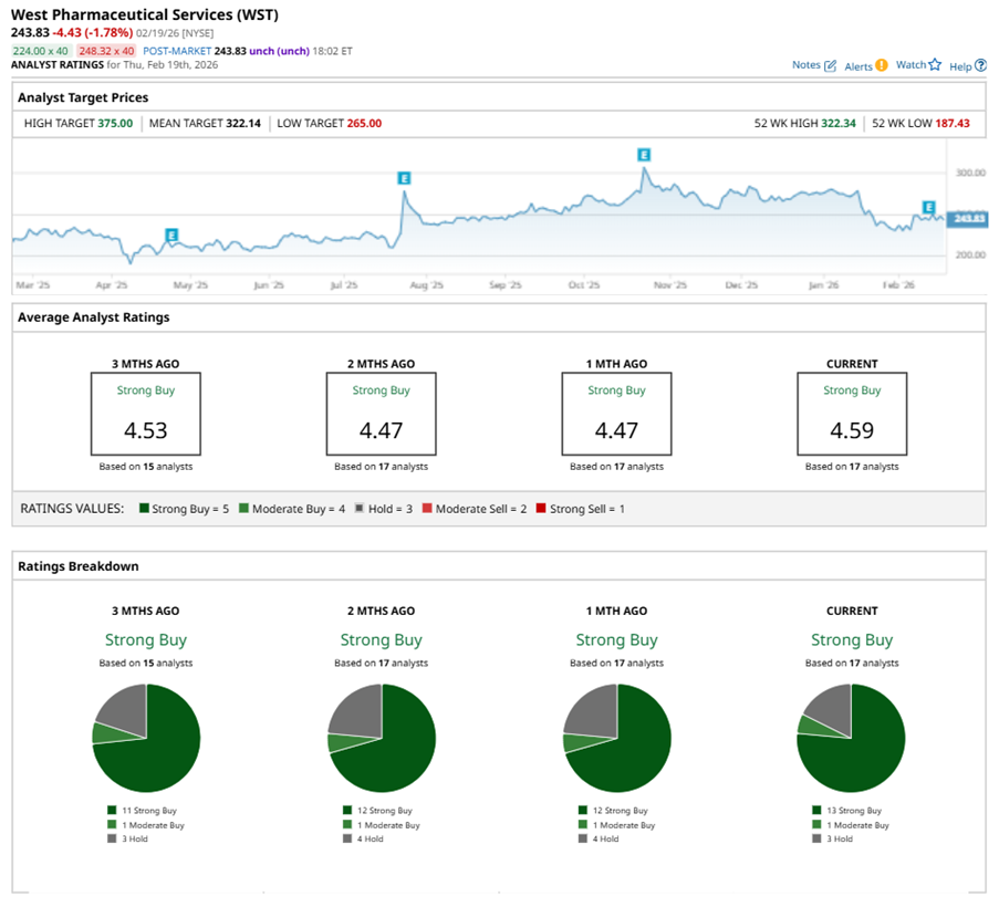 On Feb. 17, Kallum Titchmarsh from Morgan Stanley (MS) maintained a “Hold” rating on WST with a price target of $285, implying a potential upside of 16.9% from current levels.