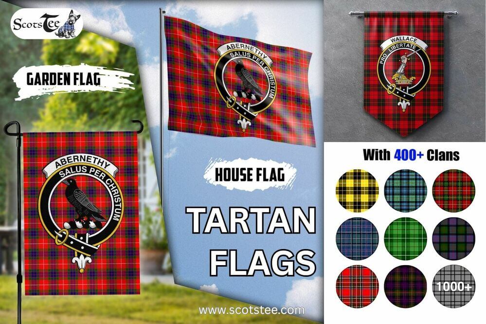 ScotsTee Tartan Flags showcase official Scottish clan crests set against traditional tartan backgrounds, offering a bold expression of heritage and pride. Ideal for festivals, cultural events, home displays, or as meaningful gifts for those with a deep connection to their lineage.