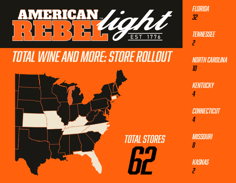 - Initial Placement for American Rebel Light Beer in either 12oz or 16oz cans is scheduled for 62 Total Wine & More Locations across 7 states.