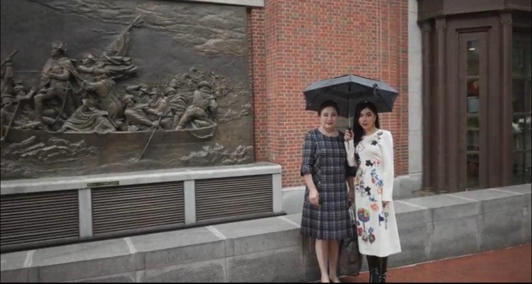 Pic Description: Dr. Ellen Qiongzhao Schicktanz and Sisi Cao standing beside the artist’s monumental bronze relief, Washington Crossing the Delaware, at the Museum of the American Revolution in Philadelphia.