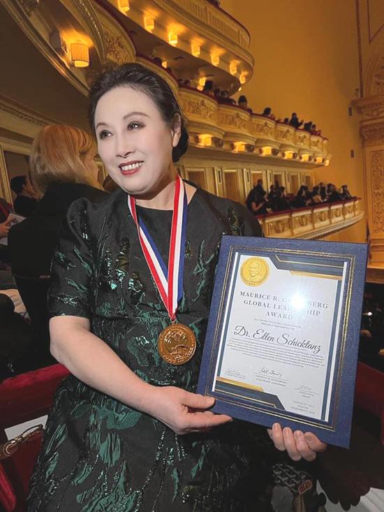Pic Description:Dr. Schicktanz receiving the Maurice R. Greenberg Global Leadership Award, honoring her lifelong contributions to public art and cultural diplomacy.
