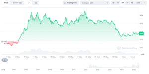 Dogecoin is hanging around $ 0.19 after a small drop in hte past couple of days. It slipped below some key support zones, but most analysts aren’t worried. DOGE is up by 12% in the last 30 days, so the big picture is still looking positive.