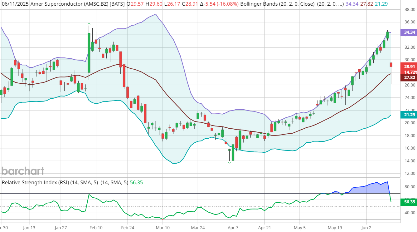 American Superconductor stock was arguably due for a pullback on the charts. The stock has been hugging its upper Bollinger Band, with its 14-day Relative Strength Index (RSI) lodged firmly in overbought territory since late May.