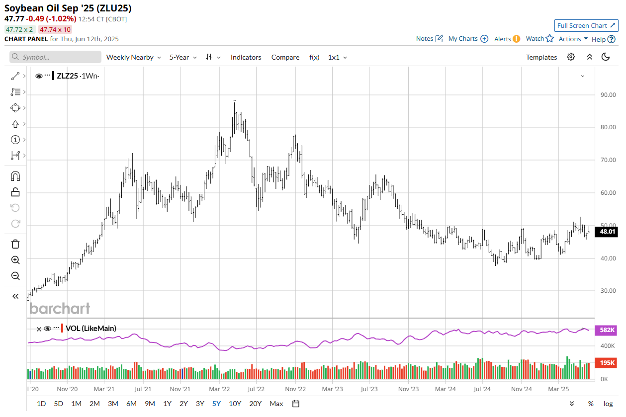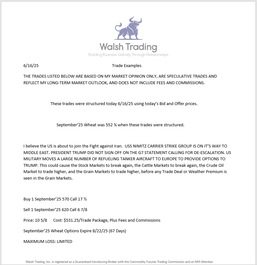 The Grain Markets were mixed again in the July'25 contract, but all higher in the August'25 and September'25 contract months today. The Beans had a solid gain today. August'25 Soybeans were 4 ½ cents higher today and settled at 1076 ¼. Today's high was 1077 ¼ and the 1-month high is 1079. Today's low was 1066 ½ and the 1-month low is 1026 ¼. Since 5/16 August'25 Soybeans are 30 cents higher or almost 3%. The Corn Market picked up a few cents today. September'25 Corn was 4 cents higher today and settled at 423 ¾. Today's high was 425 ¾ and the 1-month high is 444 ¼. Today's low was 420 and the 1-month and 52-week low is 418 ¾. Since 5/16 September'25 Corn is 2 ¼ cents higher or more than ½%. The Wheat Market has finally begun to trade higher and had a nice gain today. September'25 Wheat was 13 ¼ cents higher today and settled at 565 ½. Today's high was 568 ¼ and the 1-month high is 572 ½. Today's low was 552 ¾ and the 1-month low is 537 ¾. Since 5/16 September'25 Wheat is 26 ½ cents higher or almost 5%. The Funds are still close to record short in the Wheat market. The Wheat crop ratings have fallen, as the world seems to be getting more and more dangerous. Russia has been launching heavy attacks on Ukraine, the US looks to be more and more involved in Iran, and the Chinese could be taking another look at Taiwan as well. This is very Bullish for a Wheat Market that has the second smallest recorded planting since 1919. Now more than ever I feel we can see the Wheat shoot over 600 soon. The crop ratings for the beans were a little lower as well, and we are still waiting for trade deals to finalized. There is currently zero trade deal premium applied in the Grain Markets to date. There is still the big acreage Report at the end of the month on the 30th. We could see a drop in Corn acres with the amount of rain that fell in the South and Southeast Corn Belt. It could be the perfect storm the Grains have been waiting for. It looks like it is starting to get hot soon as well. All of the Grain Markets have their own reason to have substantial rallies over the next month or two. Just take a look at the Soybean Oil Market, and look how explosive the move higher was, and I feel that market has much more upside as well. The Funds are also still record short the Soybean Meal. We could see crazy price movement in all the Grains very soon. I still have two OTC Market Trades in December'25 Corn, and if you are a Producer and are interested in seeing them, just ask and I will email them to you. There are Grain and Livestock Trades below. Have a great night.