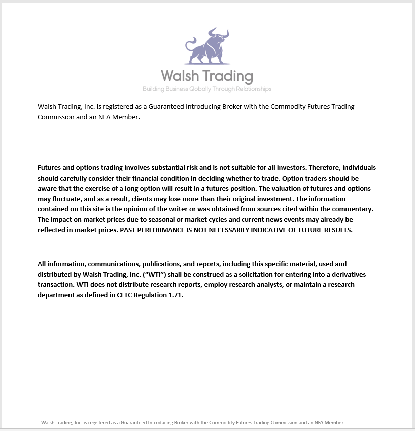 All information, communications, publications, and reports, including this specific material, used and distributed by Walsh Trading, Inc. (“WTI”) shall be construed as a solicitation for entering into a derivatives transaction. WTI does not distribute research reports, employ research analysts, or maintain a research department as defined in CFTC Regulation 1.71.