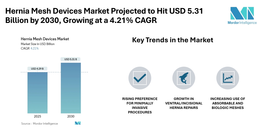 The hernia mesh devices market is projected to grow from USD 4.29 billion in 2025 to USD 5.31 billion by 2030, reflecting a compound annual growth rate (CAGR) of 4.21% over the forecast period. The hernia mesh devices market is a vital segment of the surgical devices industry, addressing one of the most common global health issues. These occur when an organ or tissue pushes through a weak spot in muscle or surrounding tissue walls, most frequently in the abdominal area. Mesh implants are widely used to reinforce tissue and reduce recurrence risk after surgical repair. According to the Mordor Intelligence report, mesh-based repair procedures are considered the standard of care for various types of hernias, particularly inguinal and ventral hernias, due to their effectiveness in minimizing complications and shortening recovery time.