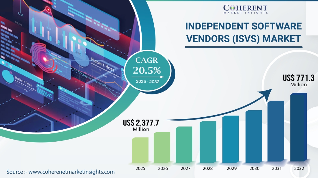 Independent Software Vendors Market size is projected to grow from USD 2,377.7 Mn in 2025 to USD 8,771.3 Mn by 2032 at a 20.5% CAGR.