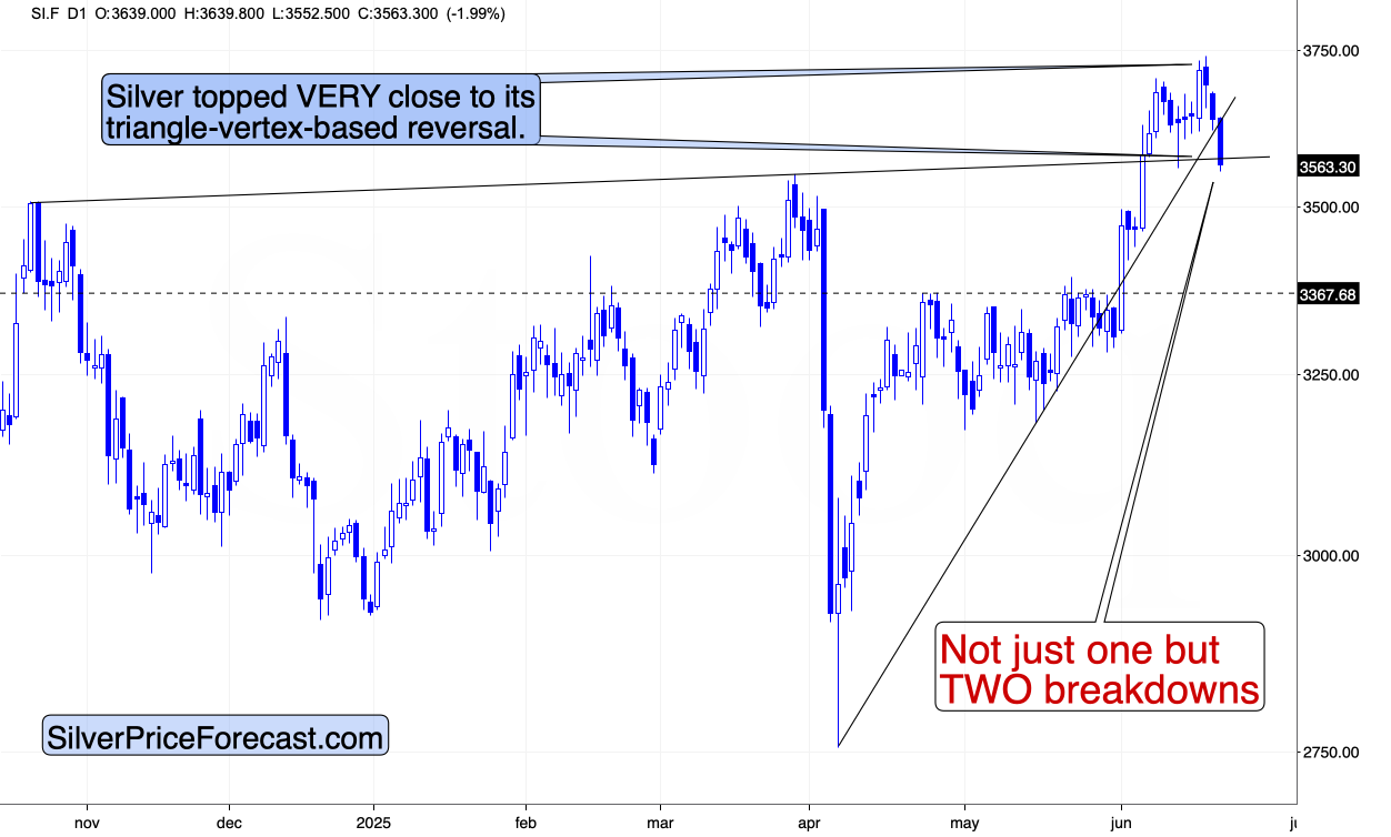 Yes, this is bearish. Even if silver moves back up in a way later, the fact that silver moved below the support lines based on the intraday price extremes is already notable. Actually, a move back up (perhaps to the rising support line) before the slide continues wouldn’t be surprising at all.