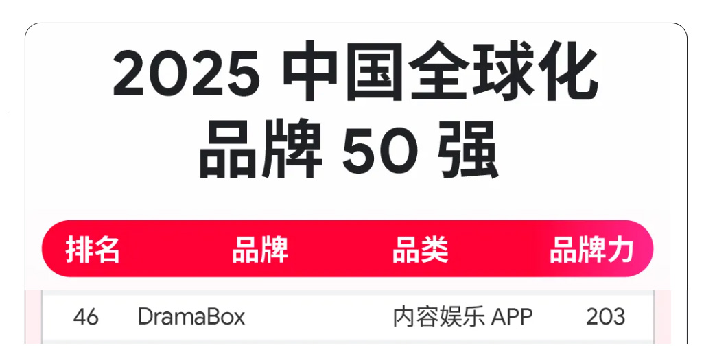 Recently, DramaBox, a global leader in short drama entertainment, earned a spot on Google's 2025 "Top 50 Chinese Global Brands" list. Recognized for its outstanding international performance and brand influence, DramaBox ranked highest among overseas entertainment apps in the short drama category. This prestigious honor once again cements DramaBox's status as a trailblazer in China's digital cultural exports.