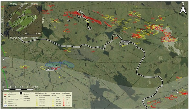The KU Discovery target is located within the Angikuni Basin, approximately 3 km from the northern margin, where historical trench sampling returned grades up to 30.7% U 3 O 8 .