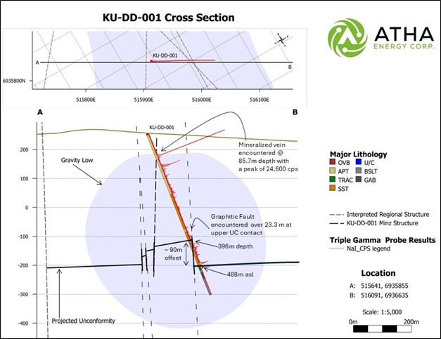 The maiden drill hole, KU-DD-001 successfully targeted stacked gravity and structural anomalies (Figure 2), intersecting shallow high-grade uranium mineralization as well as numerous zones of lower-grade mineralization throughout the hole. The hole intersected total composite mineralization of 7.1 m, including a continuous shallow zone (between 84.95 m and 87.45 m) of 0.7 m of high-grade mineralization that had max radioactivity up to 18,490 CPS (Figures 3 & 4).