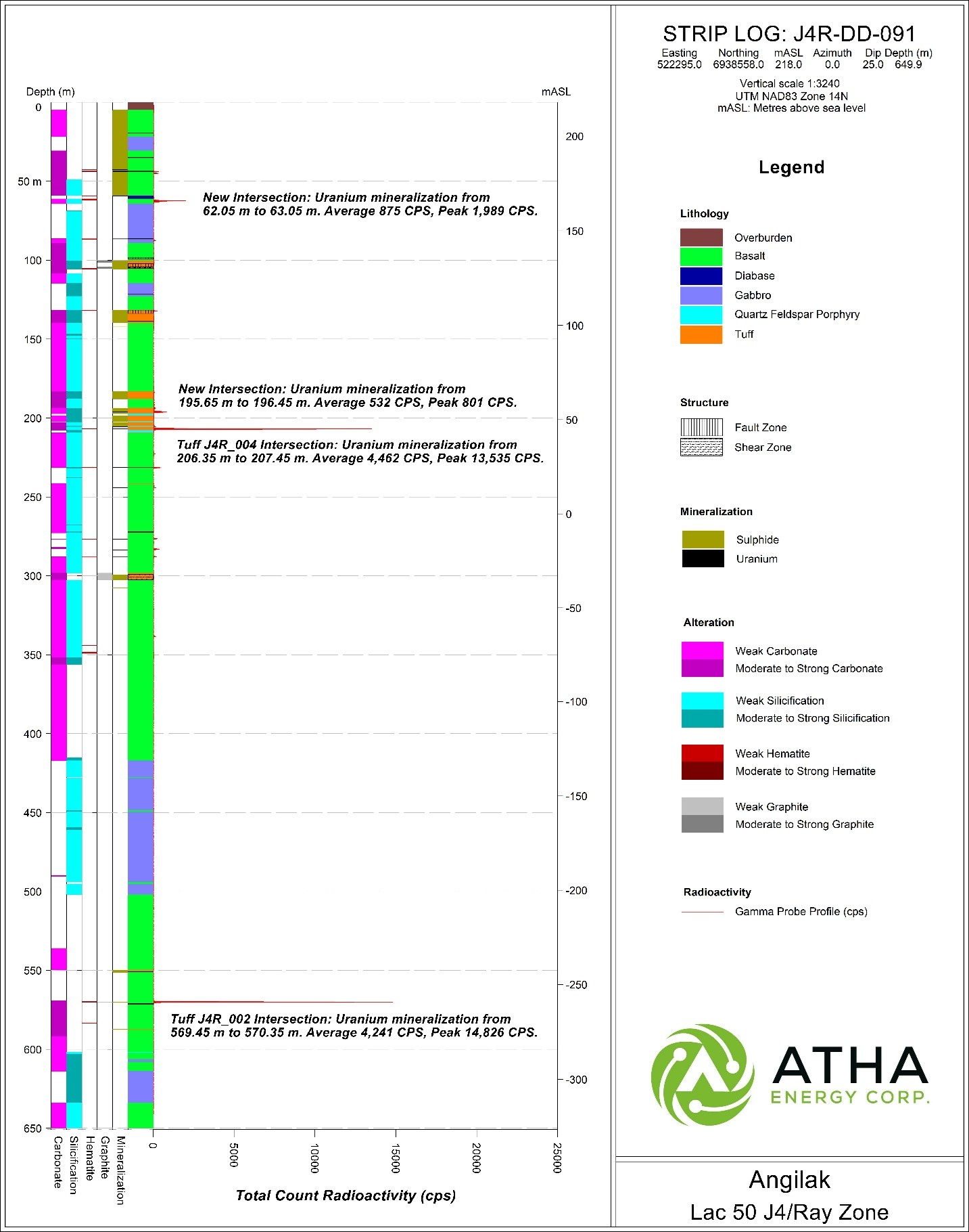 The maiden drill hole at the KU Discovery Target intersected five zones of uranium mineralization, including a shallow high-grade lense. The results demonstrate the Company's thesis that the Angikuni Basin is a direct analog to the Athabasca Basin, and that the 31 km RIB-Nine Iron Trend remains prospective for additional discoveries. At the Lac 50 Deposit, the first hole drilled at the J4/Ray Zone along the Lac 50 Trend intersected four zones of uranium mineralization, expanding the down-dip extents of the envelop of mineralization. J4R-DD-091 demonstrates that the Lac 50 Deposit remains open and unconstrained.