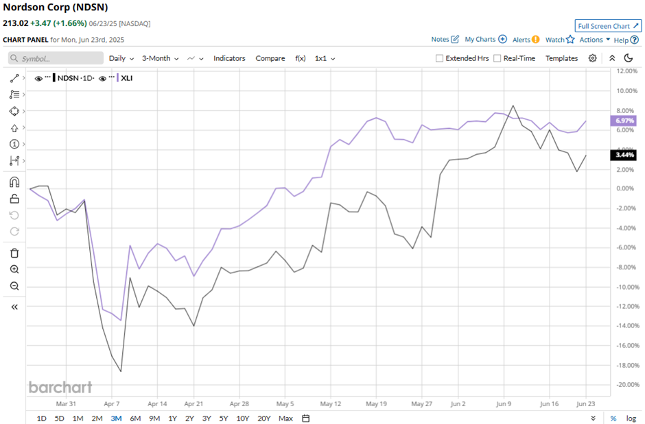 Shares of Nordson have dipped 20.2% from its 52-week high of $266.86. NDSN stock has risen 4.5% over the past three months, underperforming the Industrial Select Sector SPDR Fund’s (XLI) 8.8% increase.